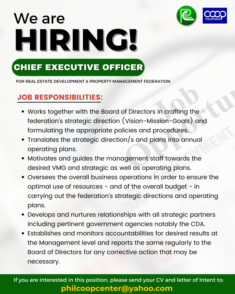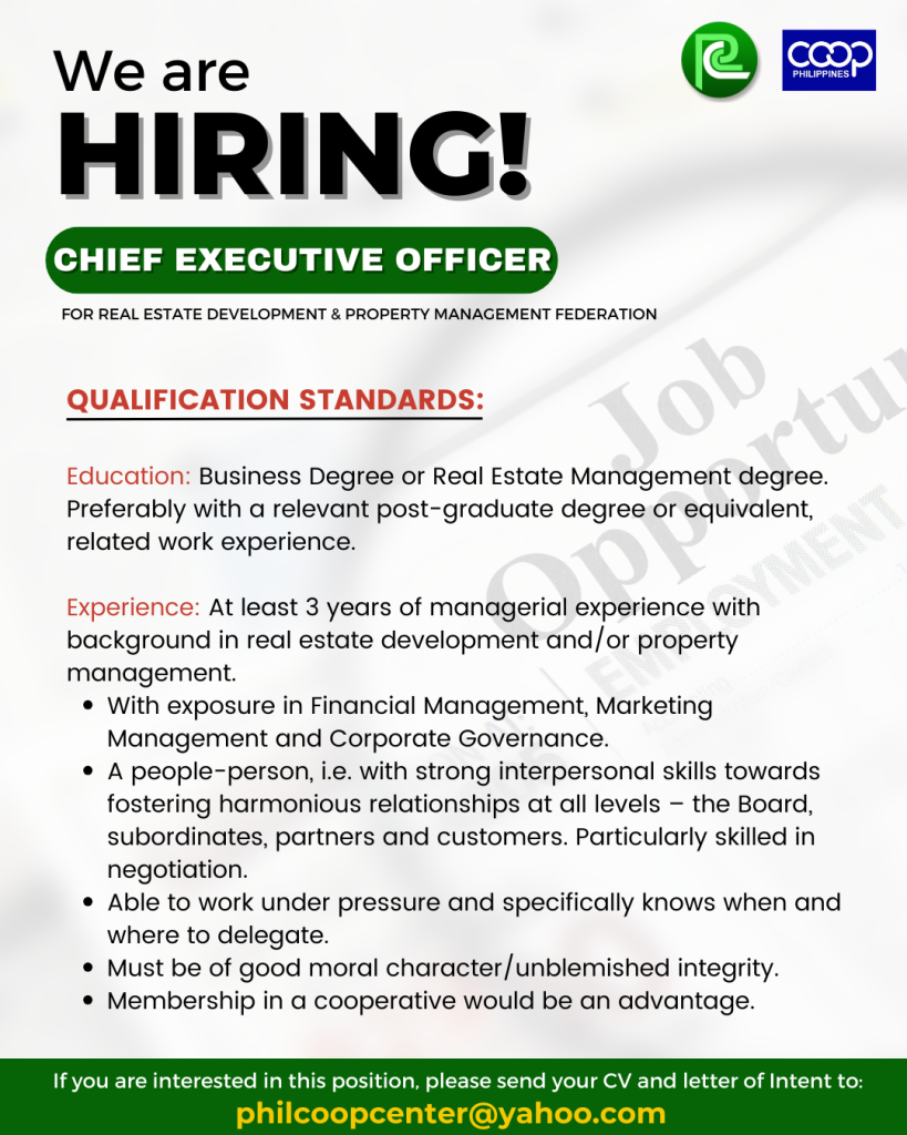 The Philippine Cooperative Center is hiring for the position of Chief Executive Officer for Real Estate Development and Property Management Federation.